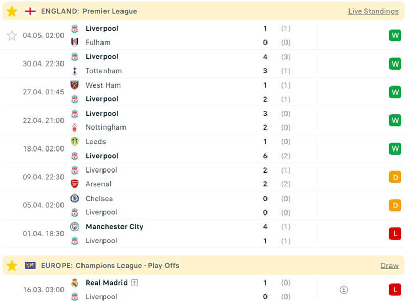 Mặc dù Liverpool đang có nguy cơ rất cao không được dự Champions League, nhưng với bản lĩnh của đội bóng lớn đang giúp Liverpool vực dậy mạnh mẽ. Trải qua 9 vòng đấu, đội bóng này đã có được 25 bàn thắng. Trong 7 trận đấu gần đây khi được chơi trên sân nhà thì Liverpool đều ghi từ 2 bàn thắng trở lên.