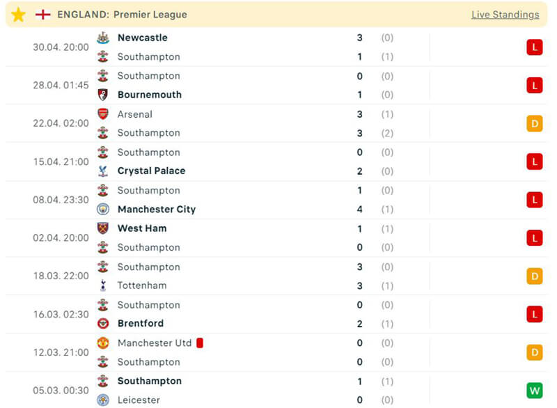 Trong khi đó, Southampton lại đang nằm bất động ở cuối bảng xếp hạng. Trong 6 trận đấu vừa qua họ mới chỉ có được duy nhất 1 điểm, không chỉ vậy họ còn thua bạc nhược trước chính sân nhà. Trải qua 34 trận đấu, Southampton đã để lọt lưới tới 60 lần, điều này cho thấy tình hình của đội bóng tệ hại đến mức nào.