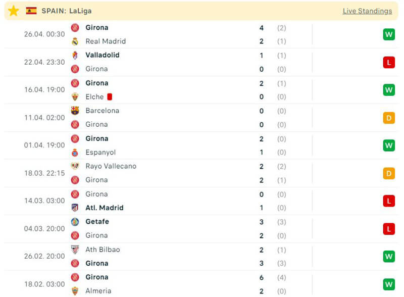 Trong khi đó, Girona đang thi đấu rất bay khi đã có tới 93 bàn thắng được ghi qua 31 vòng đấu. Đội bóng này còn cầm hoà được Barcelona và đánh bại cả Real Madrid.